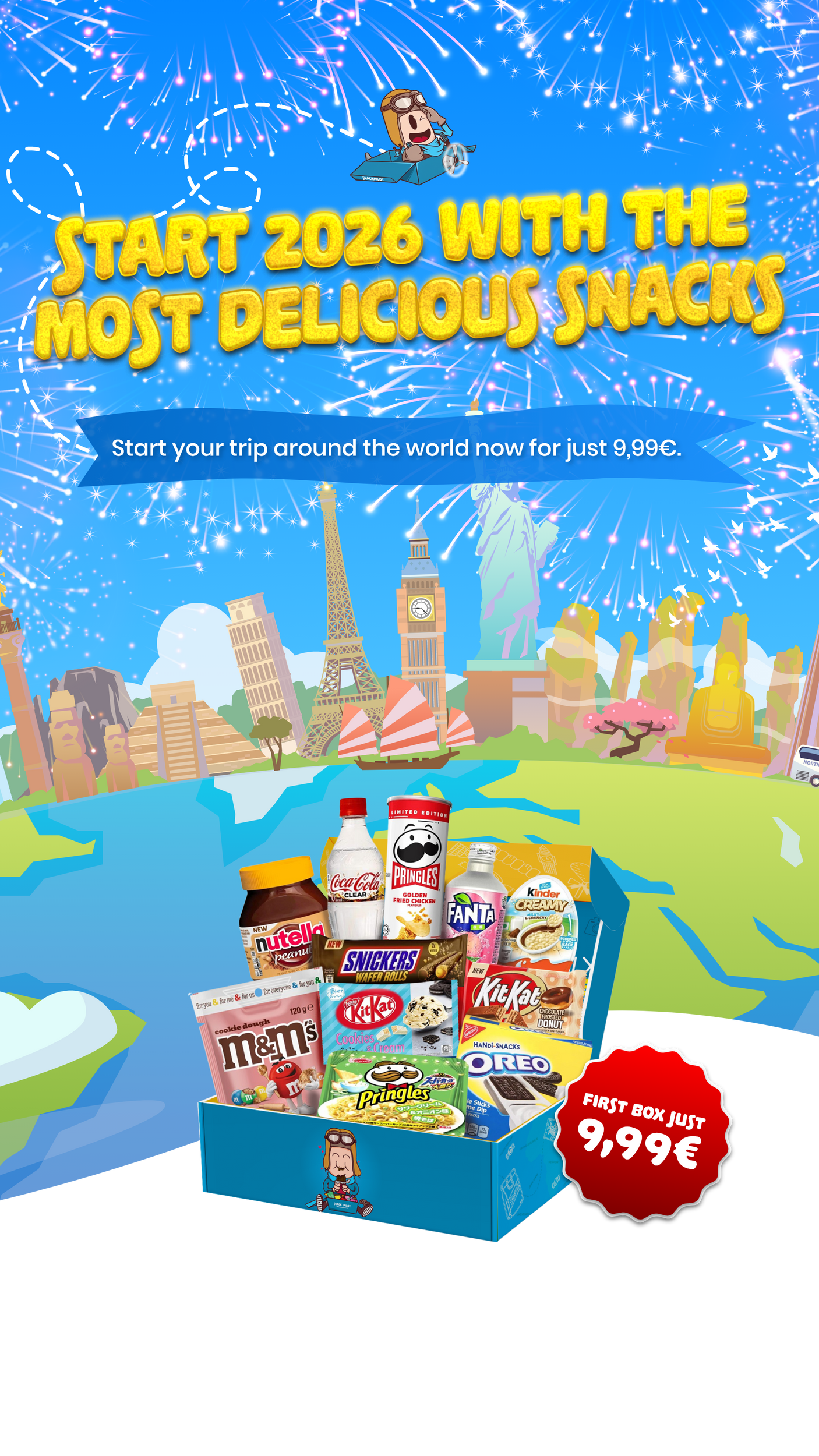 SnackPilot si klade za cíl obletět celý svět a zbořit hranice mezi rozmanitými kulturami občerstvení v Evropě a dalších zemích prostřednictvím vzrušujících svačinových boxů s tématem amerických států a zemí. Tento obrovský cíl je podporován naší touhou představit Evropu různé kultury, které jsou neodmyslitelně součástí každého občerstvení ze zemí celého světa.